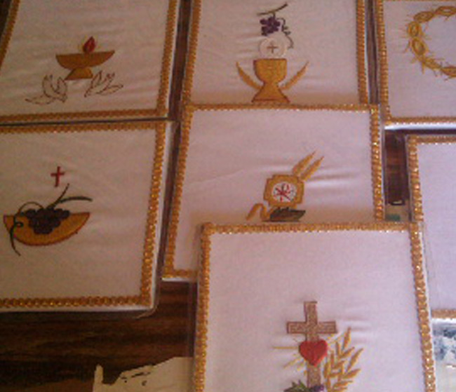 De igual forma se diseñan y elaboran mantelería, bordados y ornamentos (blanco, verde, rojo y morado) para palias, purificadores, corporales, manisterios, manteles de tres piezas (mantel, cubre ambón y cortina de sagrario), estandartes, banderas , cazullas, albas, ornamentos, estolas, cíngulos, paño de hombros.